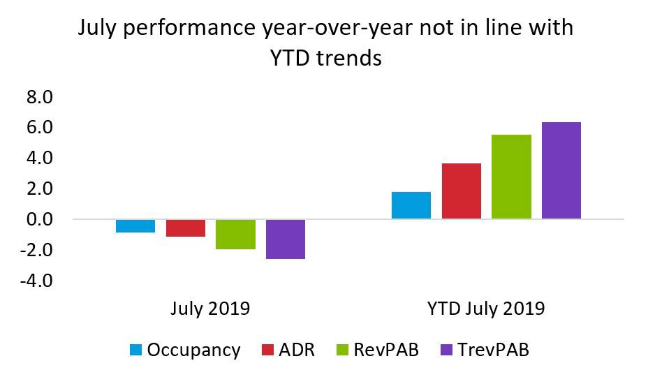 The flip side to such high occupancy, however, is often lackluster growth. (It’s difficult to sell more beds if beds already are sold out.) That was the case this July, when occupancy fell 0.8% from July 2018.