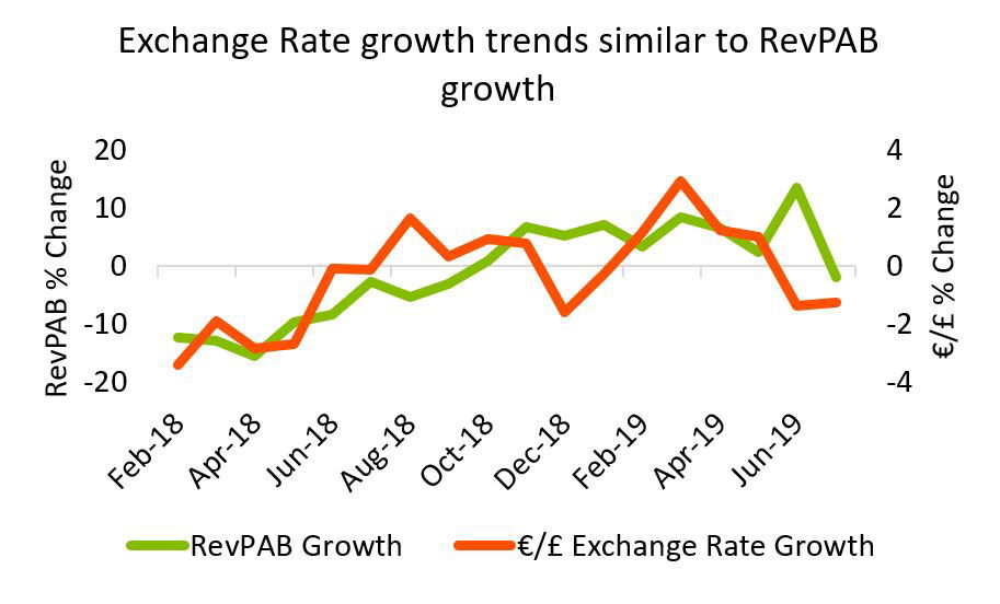Hostel RevPAB and the EUR/GBP exchange rate experienced similar growth patterns over the past 18 months, as evidenced by a statistically significant 57% correlation coeffiecient. A slow rise over the past 18 months ended on a down note in July for both metrics.