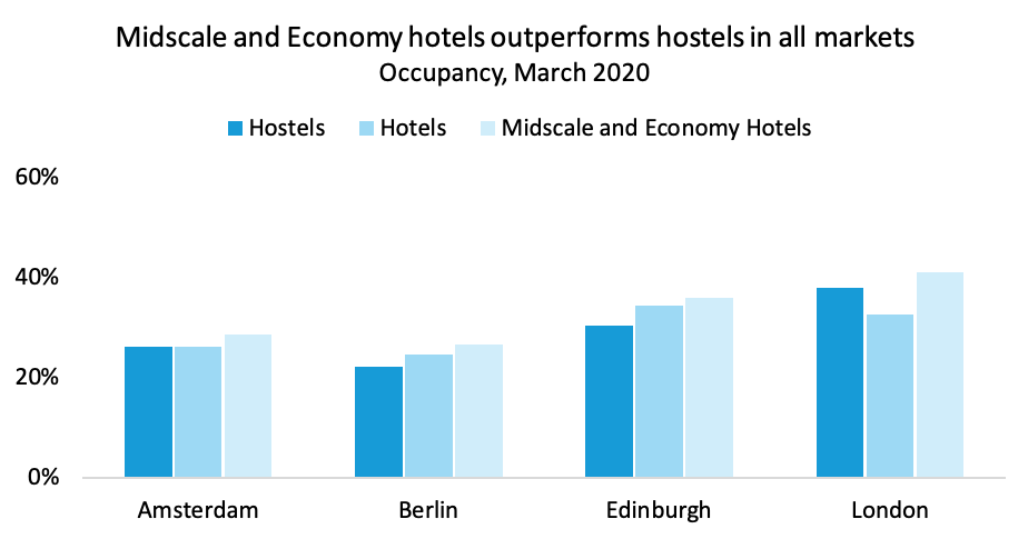 March hostel occupancy dipped below 40% in all four markets, a year-over-year decline of more than 50% in each. Compared to hotels, only Amsterdam and London hostels filled more spaces than did hotels. This is surprising, because Midscale and Economy class hotels – those properties with the lowest Average Daily Rates (ADRs) – have consistently outperformed all hotels globally, largely due to their affordability.